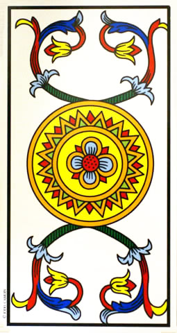数札は「ウェイト」版のような具体的な絵ではなく、数字とスートを描いた抽象的な絵柄が特徴です。